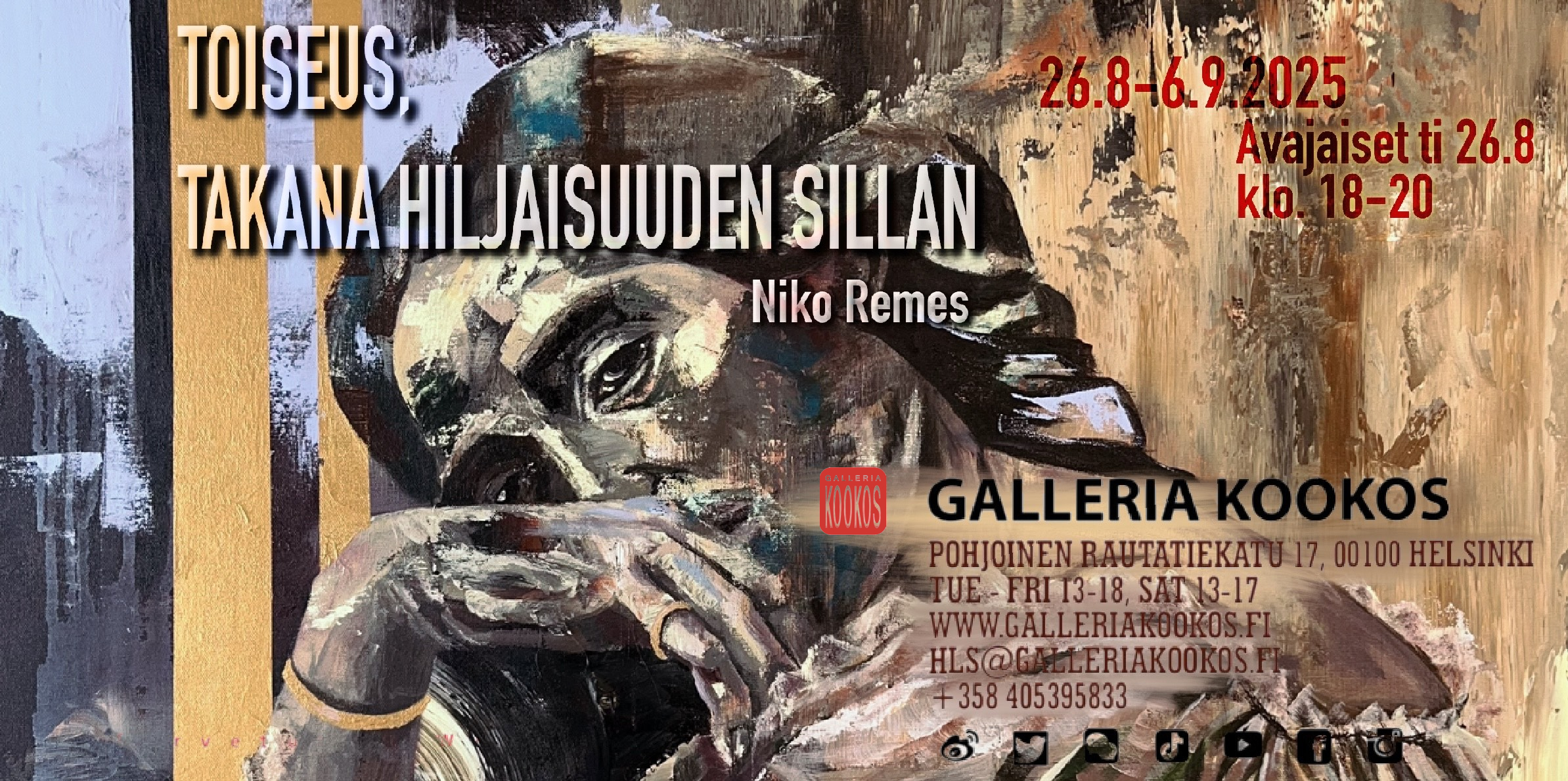 Toiseus, Takana Hiljaisuuden SillanNiko Remeksen yksityisnäyttely26.8-6.9.2025Avajaiset 26.8.2025 klo 18-20 Niko Remeksen maalaukset pyrkivät vangitsemaan jokaisessa ihmisessä ja esineessä piilevien tarinoiden olennaisuuden....